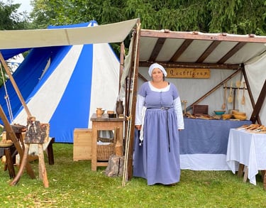 Ich arbeite in mittelalterlicher Gewandung und richte meinen Stand so aus, dass er sich stimmig in historische Ambiente einfügt.